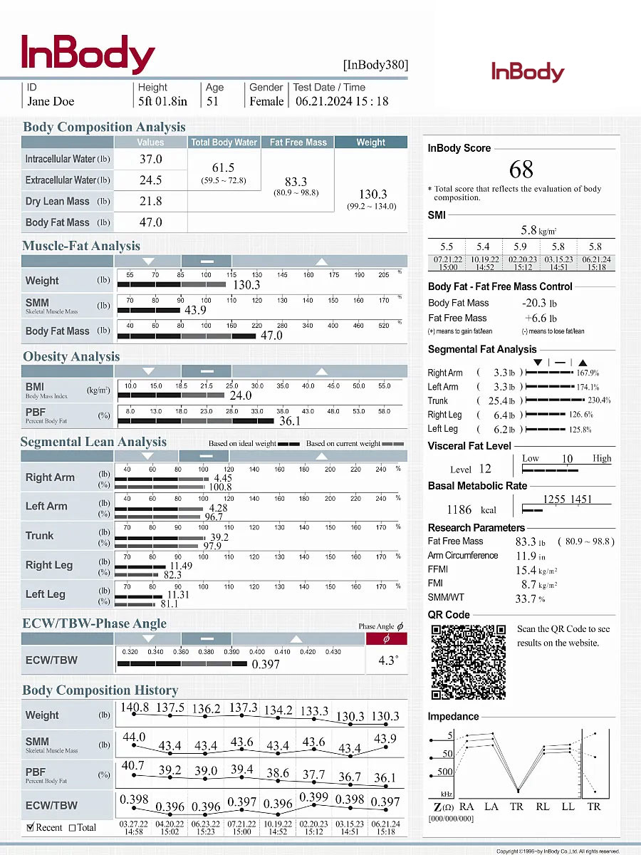 Standard OutputsWeight, Total Body Water, Soft Lean Mass, Lean Body Mass, Body Fat Mass, Skeletal Muscle Mass, Percent Body Fat, Segmental Lean Analysis, Body Composition History, ECW Ratio-Phase Angle, Whole Body Phase Angle